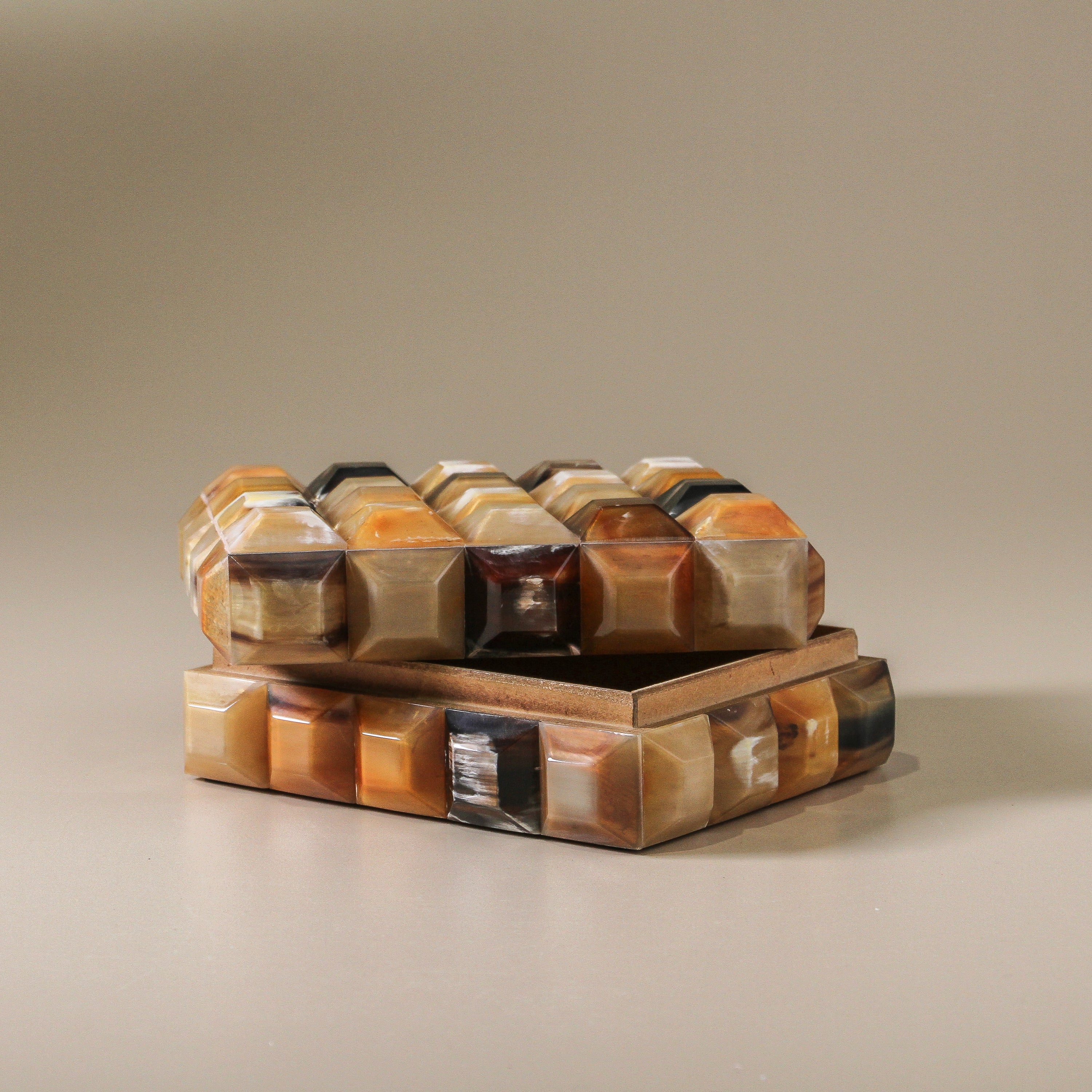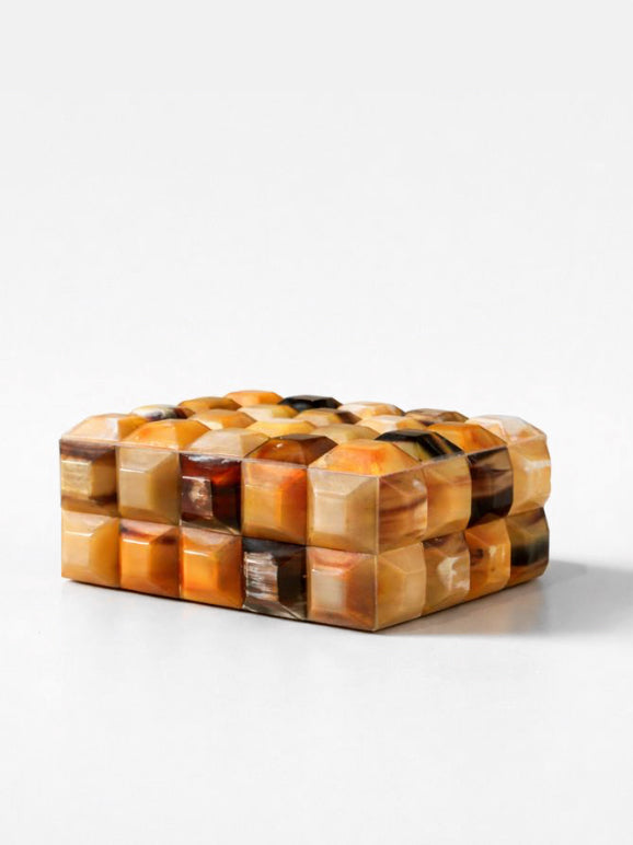 Dazzling in detail, the Prism Horn Box is a sculptural treasure—every facet layered in jewel-like horn, rich with natural variation. Shades of warm tobacco, ivory, and deep caramel ripple across its surface, catching the light like a mosaic of polished stone.