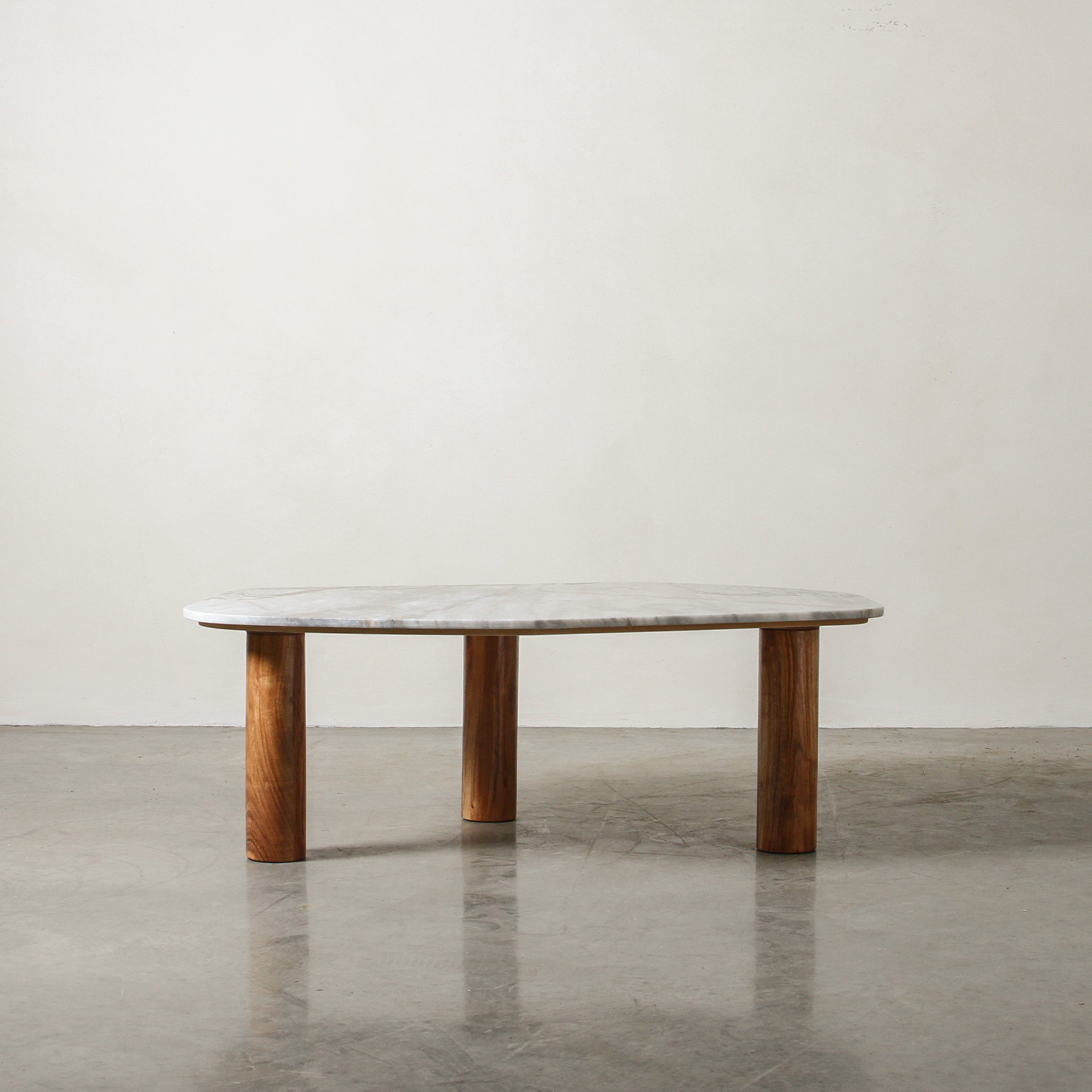 The Clifton Table stands on three column-shaped wooden legs, providing both stability and a visually intriguing design element.
